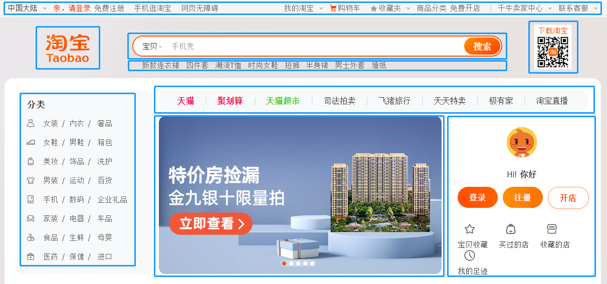 通过下图我们可以看到,一个网页是由很多区域组合构成的,即使用 HTML 标签布局。